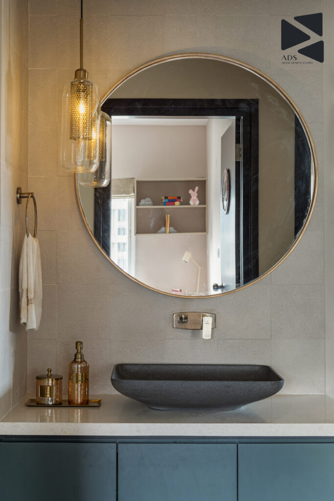 A dark-toned countertop basin contrasts beautifully against the muted wall finishes, while clean-lined cabinetry ensures practical storage. The overall composition feels refined, balanced, and timeless, echoing the home’s design ethos.