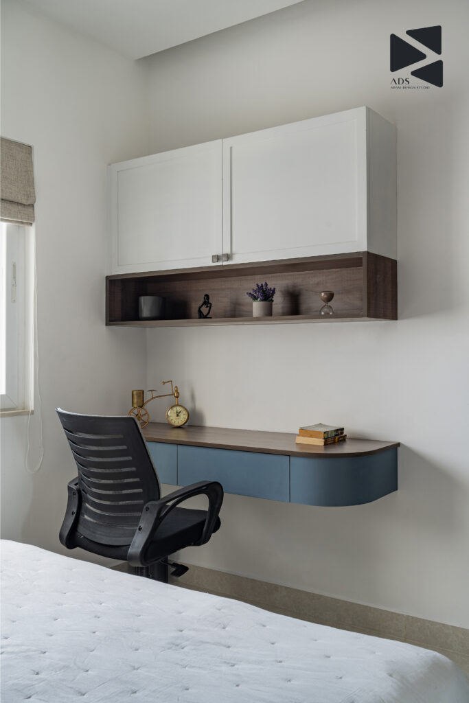 A floating study table paired with overhead storage keeps the area light and organised. Neutral finishes and clean lines promote focus, while subtle décor elements prevent the space from feeling clinical.