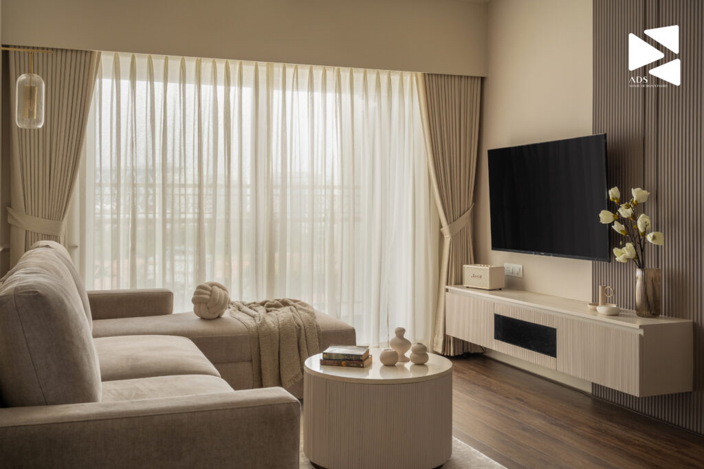 The living room introduces the home’s design language calm, neutral, and meticulously layered, making it an example of the best living room interior design for contemporary apartments. Anchored in beige and warm grey tones, the palette allows natural light to flow freely through sheer curtains, enhancing openness and visual comfort.