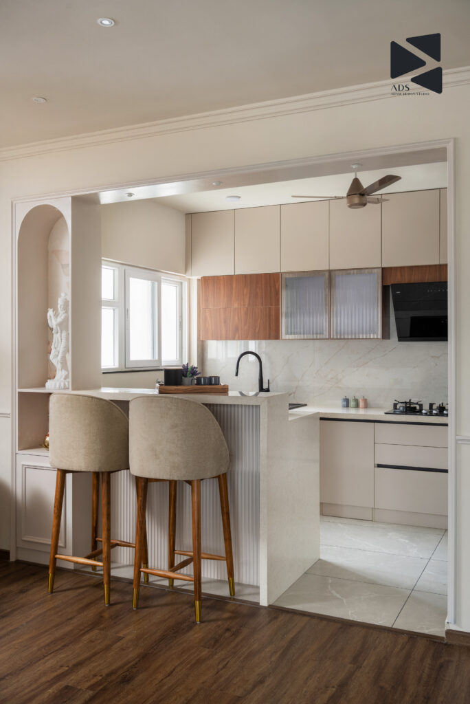 The kitchen is designed as a functional yet visually seamless extension of the dining area, showcasing the best kitchen interior design principles for modern apartments. A soft neutral colour palette ensures continuity, while warm wood finishes add depth and tactile richness.