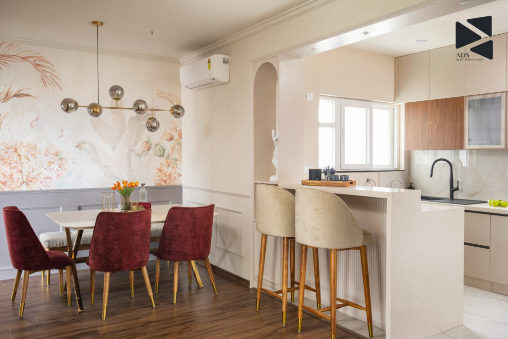 The dining area is a visual highlight of Nainika Apartment and a fine representation of the best dining room interior design philosophy. A floral mural wallpaper forms a gentle artistic backdrop, adding personality without overwhelming the space.