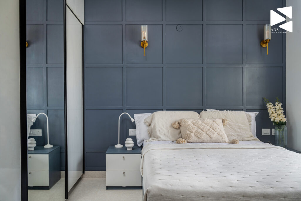 An upholstered headboard with vertical detailing becomes the focal point, adding texture without visual heaviness. Layered lighting, pendant lights, ambient illumination, and filtered daylight creates a soothing atmosphere throughout the day.